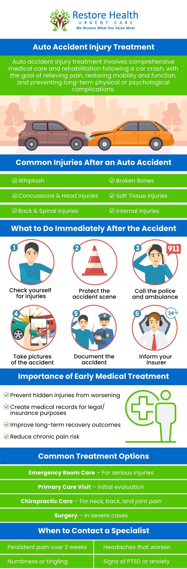 At Restore Health Urgent Care, we understand the complexities and challenges associated with auto accident injuries. These injuries can range from superficial cuts and bruises to more severe conditions like fractures, traumatic brain injuries, or internal damage. The severity often depends on factors such as the speed and point of impact, seat belt usage, and whether airbags were deployed.